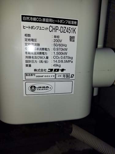 天理市 コロナエコキュート→コロナ自然冷媒CO2家庭用ヒートポンプ給湯機 ヒートポンプユニットCHP-DZ451K エコキュート交換工事