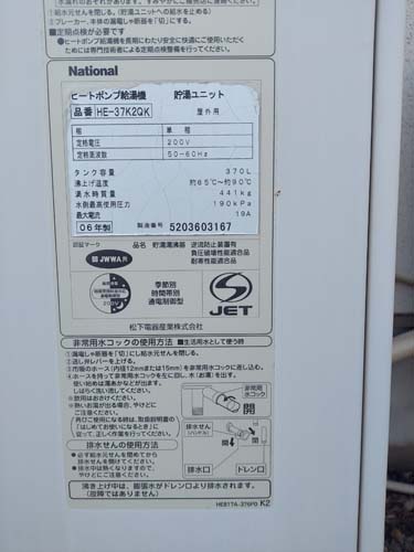 山添村 Nationalヒートポンプ給湯機貯湯ユニットHE-37K2QK→コロナ自然冷媒CO2家庭用ヒートポンプ給湯機貯湯ユニットCTU-37AZ1K、ヒートポンプユニットCHP-DZ451K エコキュート交換工事