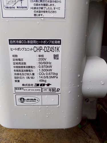 大和郡山市栄町 コロナ自然冷媒CO2家庭用ヒートポンプ給湯機 ヒートポンプユニットCHP-DZ451K エコキュート交換工事