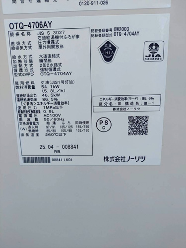 大和高田市大東町 ノーリツ給湯器→ノーリツ石油給湯機付ふろがまOTQ-4706AY 給湯器交換工事